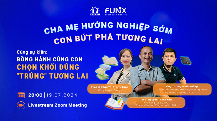 Ngày 19/07 tới đây, hệ thống giáo dục HOCMAI x FUNix sẽ tổ chức sự kiện livestream “ĐỒNG HÀNH CÙNG CON: CHỌN KHỐI ĐÚNG – “TRÚNG” TƯƠNG LAI”. Tham gia sự kiện, phụ huynh và học sinh sẽ có thêm nhiều góc nhìn và thông tin bổ ích xoay quanh chủ đề hướng nghiệp.