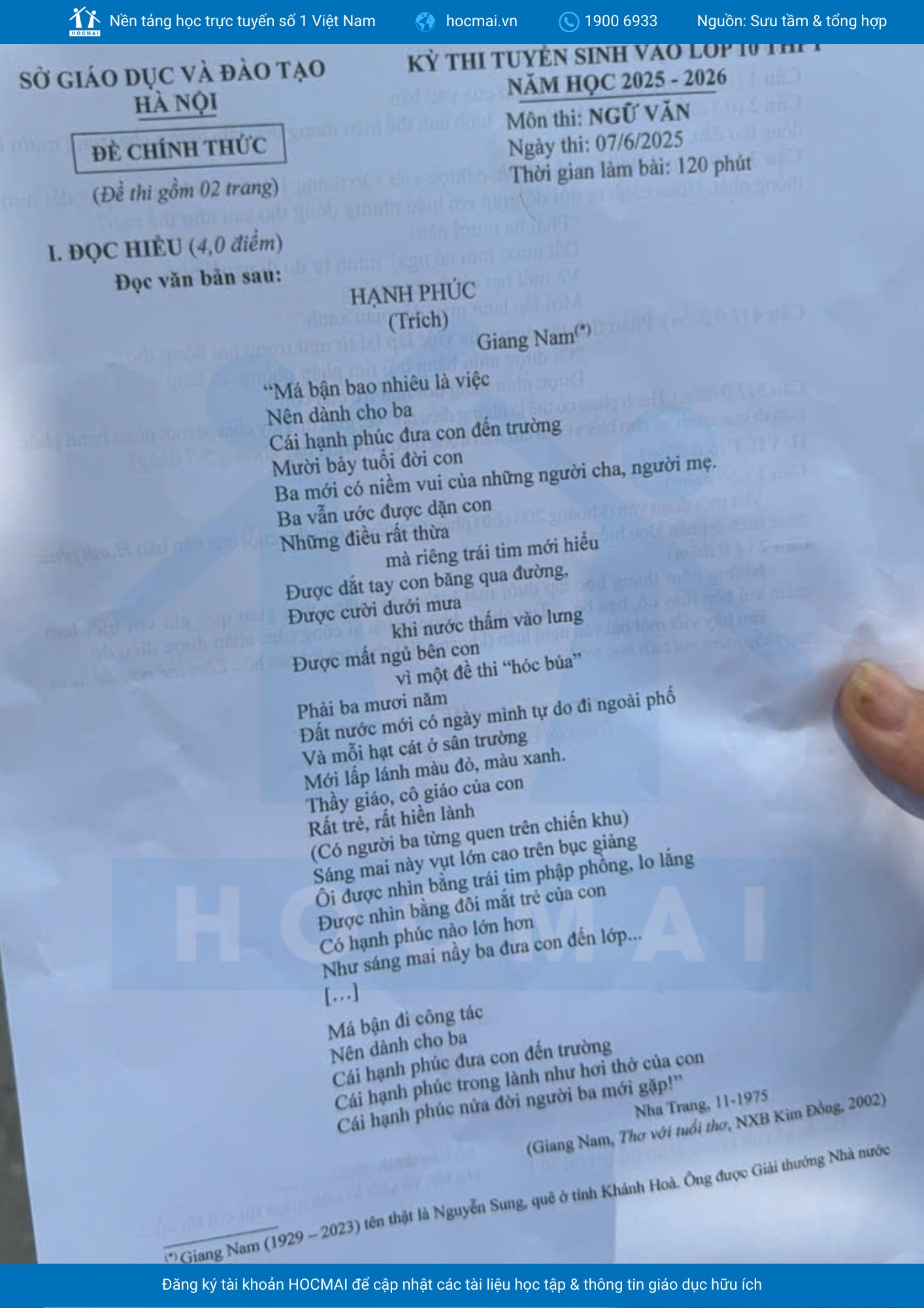 Phần đọc hiểu trích từ bài thơ “Hạnh phúc” của nhà thơ Giang Nam – một văn bản giàu cảm xúc về tình cha con, niềm hạnh phúc giản dị sau chiến tranh, giúp học sinh dễ dàng liên hệ thực tế và khai thác chiều sâu nhân văn. Các câu hỏi đọc hiểu được thiết kế từ nhận biết đến vận dụng cao, có liên hệ bối cảnh sáng tác (1975) và thể hiện rõ thông điệp yêu thương, biết ơn những điều bình dị.