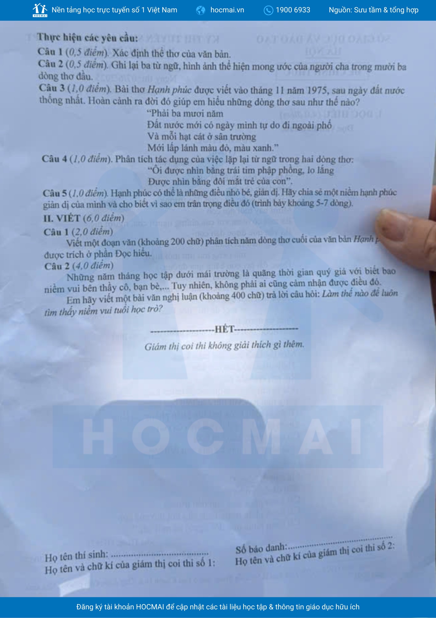 Phần Viết chiếm 6,0 điểm, thí sinh cần lưu ý yêu cầu viết đoạn văn 200 chữ (câu 1) phân tích năm dòng thơ cuối của văn bản Hạnh phúc với yêu cầu giới hạn về phạm vi ngữ liệu và dung lượng. Câu 2 yêu cầu viết bài văn nghị luận trả lời cho câu hỏi: Làm thế nào để luôn tìm thấy niềm vui tuổi học trò? là một yêu cầu không hề khó, khá gần gũi với lứa tuổi học trò và chắc hẳn các bạn học sinh Hà Nội đã khá quen với những đề tài này trong quá trình ôn tập.