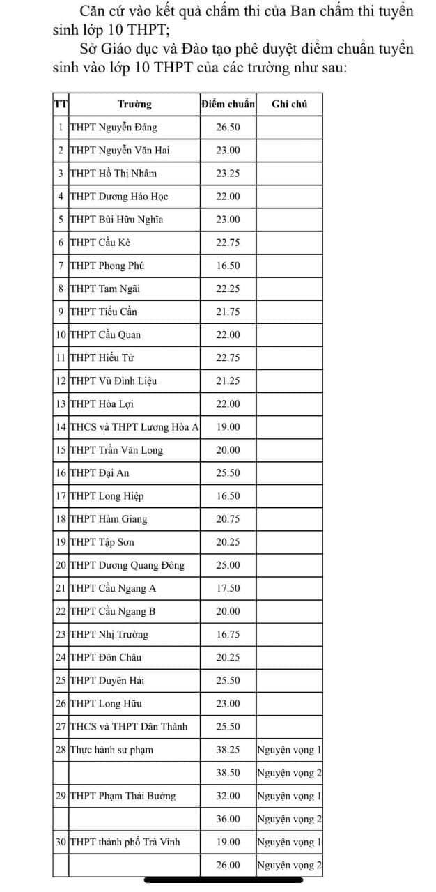 Điểm chuẩn lớp 10 Trà Vinh năm 2024-2025