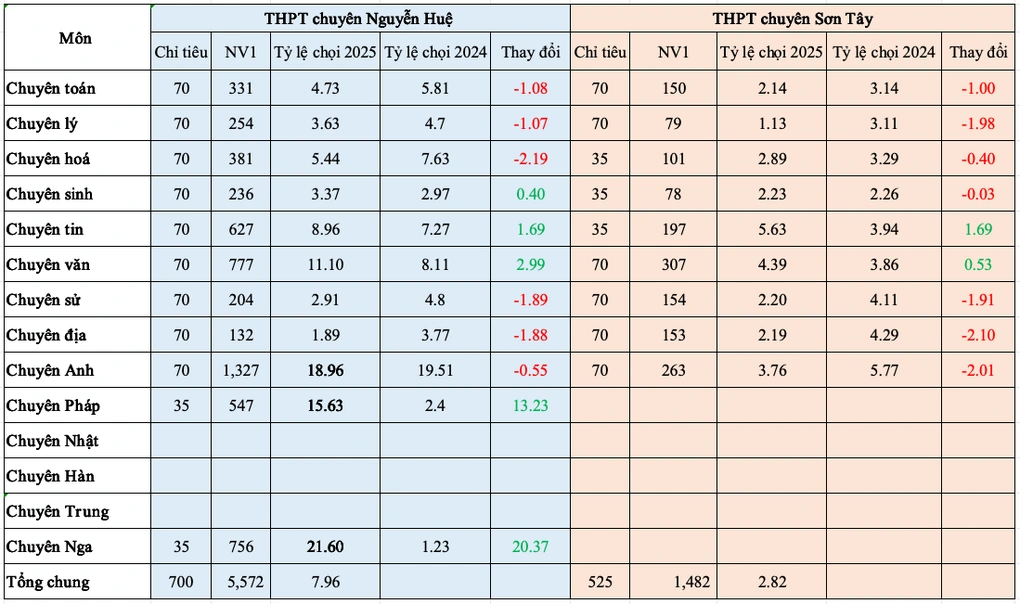 Tỷ lệ lớp 10 vào Trường THPT chuyên Nguyễn Huệ và Sơn Tây