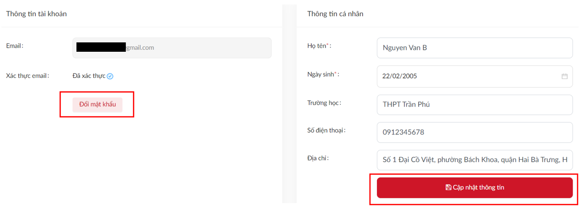 Thí sinh sửa thông tin cá nhân đã kê khai hoặc đổi mật khẩu bằng cách truy cập vào mục “Tài khoản”, và chọn chỉnh sửa Hồ sơ dự thi đã kê khai. Thí sinh có thể cập nhật thông tin nhiều lần, hệ thống căn cứ vào lần sửa cuối cùng là thông tin cá nhân chính thức của thí sinh.