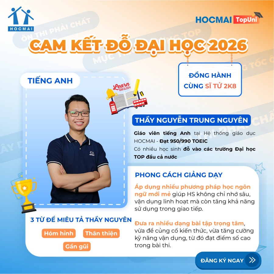 Với hơn 18 năm kinh nghiệm trong giảng dạy và luyện thi, đội ngũ thầy cô tại HOCMAI trở thành người bạn đồng hành đáng tin cậy của hơn 50.000 học sinh trên hành trình chinh phục kỳ thi tốt nghiệp THPT và tuyển sinh đại học.