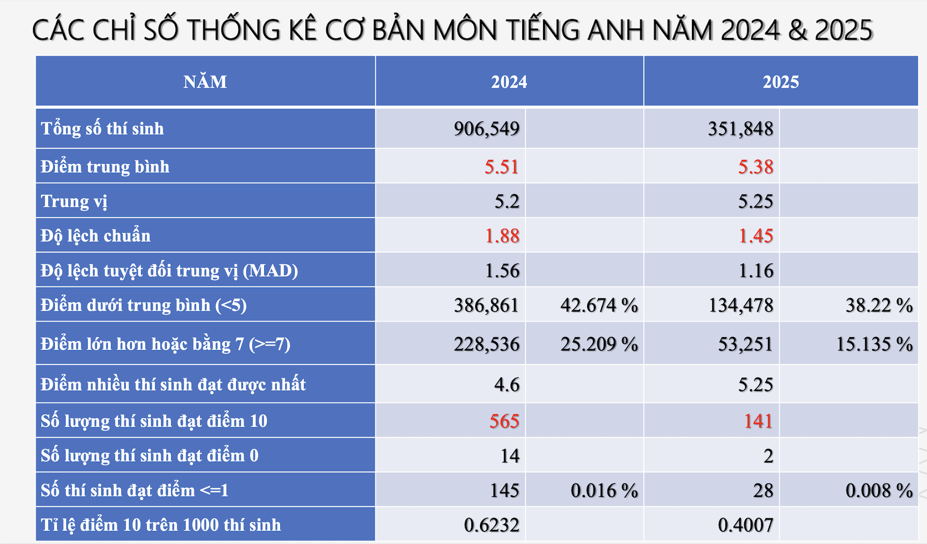 Mặc dù đề thi tiếng Anh được đánh giá “khó, có tính phân hóa cao”, điểm trung bình vẫn đạt 5,38 (điểm trung vị 5,2) với tổng cộng 351.848 thí sinh dự thi. Đây là tín hiệu cho thấy phần lớn học sinh chọn môn này đều có năng lực khá – giỏi, nên phổ điểm không quá thấp.