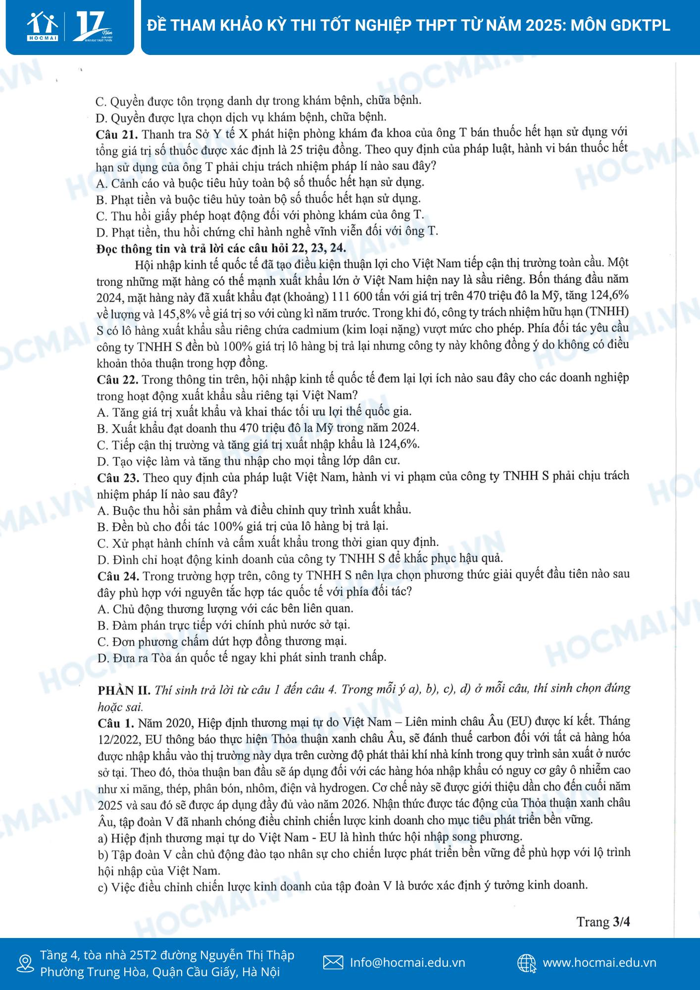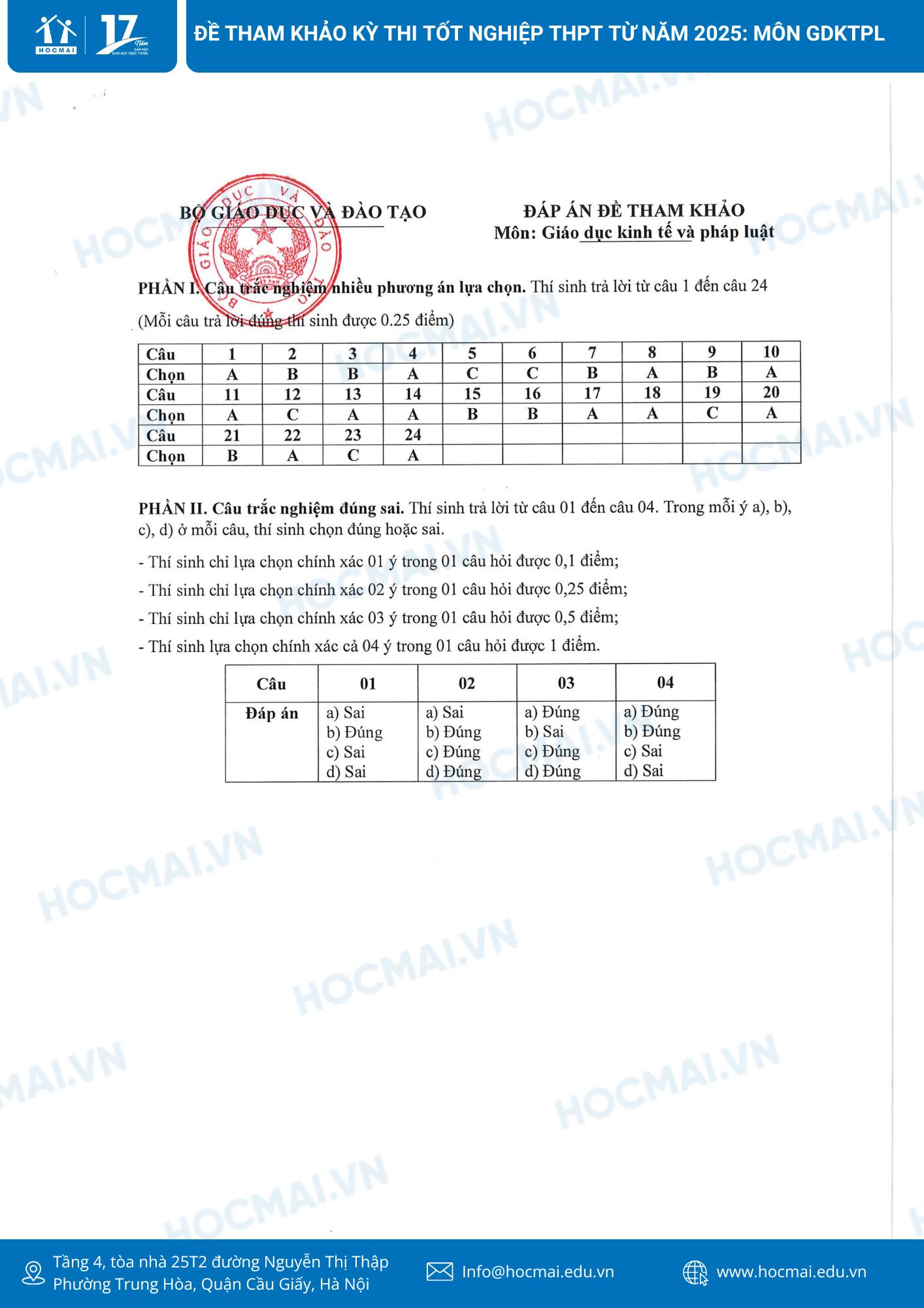 1. Đề thi tham khảo và đáp án môn Giáo dục Kinh tế và Pháp luật học kỳ thi tốt nghiệp THPT 2025