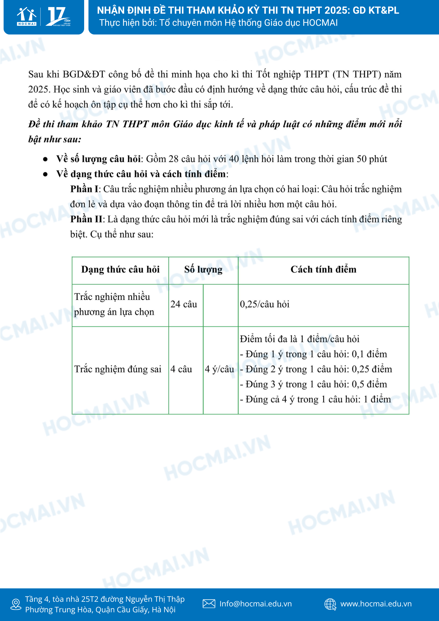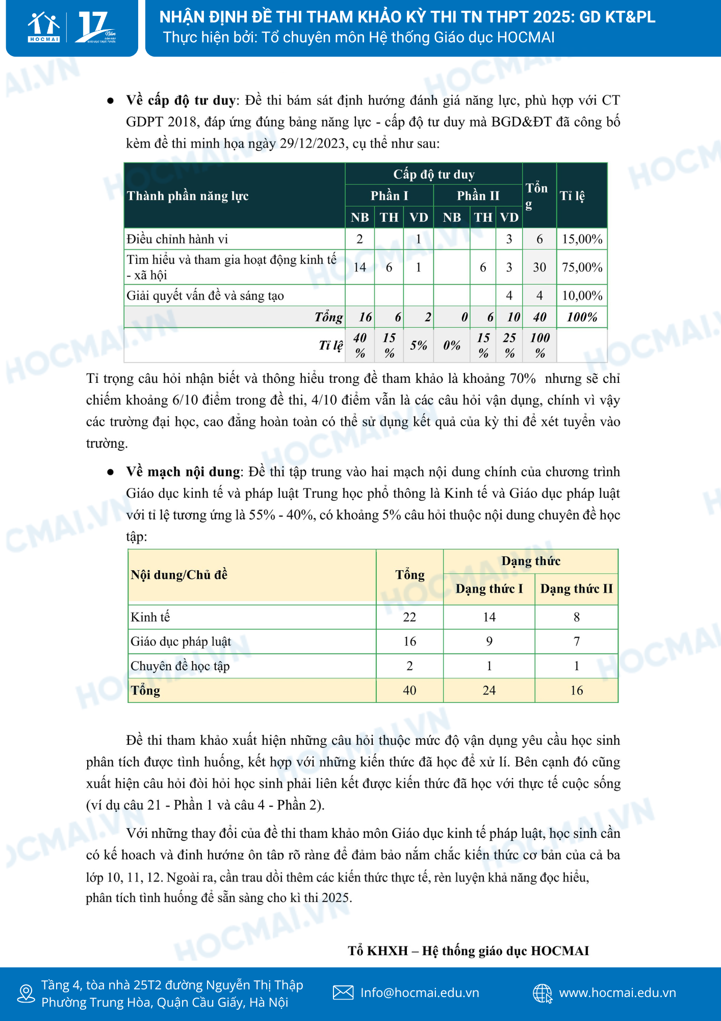 Ngay sau khi Bộ GD&ĐT công bố đề, đội ngũ giáo viên của Hệ thống giáo dục HOCMAI đã nhanh chóng đưa ra những nhận định để giúp học sinh tham khảo và có những định hướng ôn tập rõ ràng hơn trong việc ôn luyện. Dưới đây là nhận định về đề thi tham khảo môn Giáo dục Kinh tế và Pháp luật do đội ngũ giáo viên thuộc môn Giáo dục Kinh tế và Pháp luật của HOCMAI thực hiện, quý phụ huynh và học sinh cùng theo dõi!
