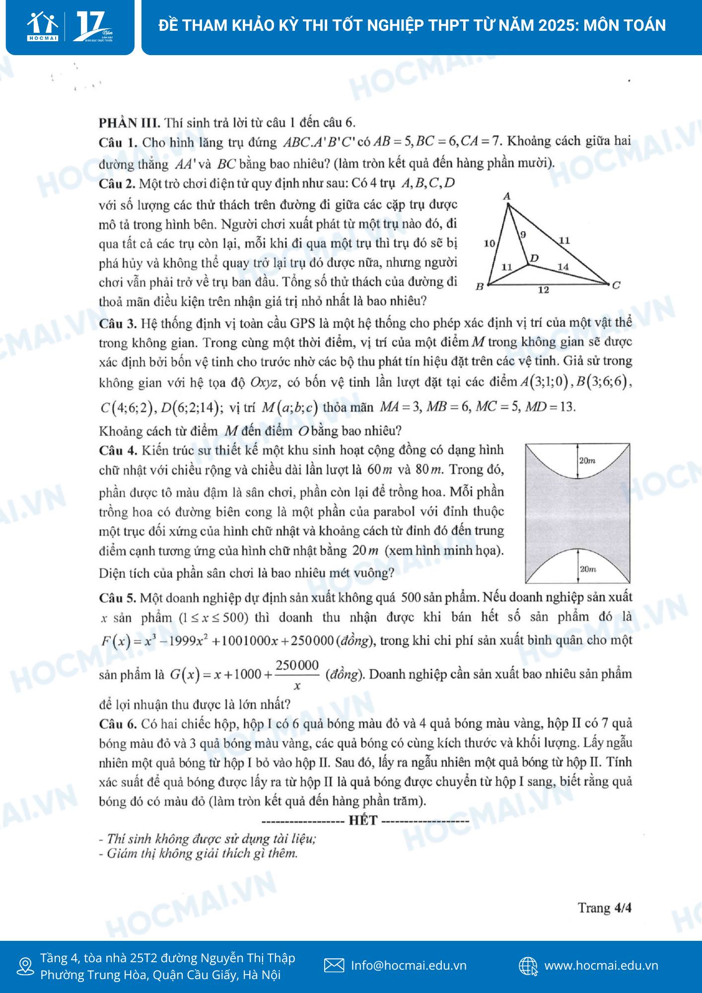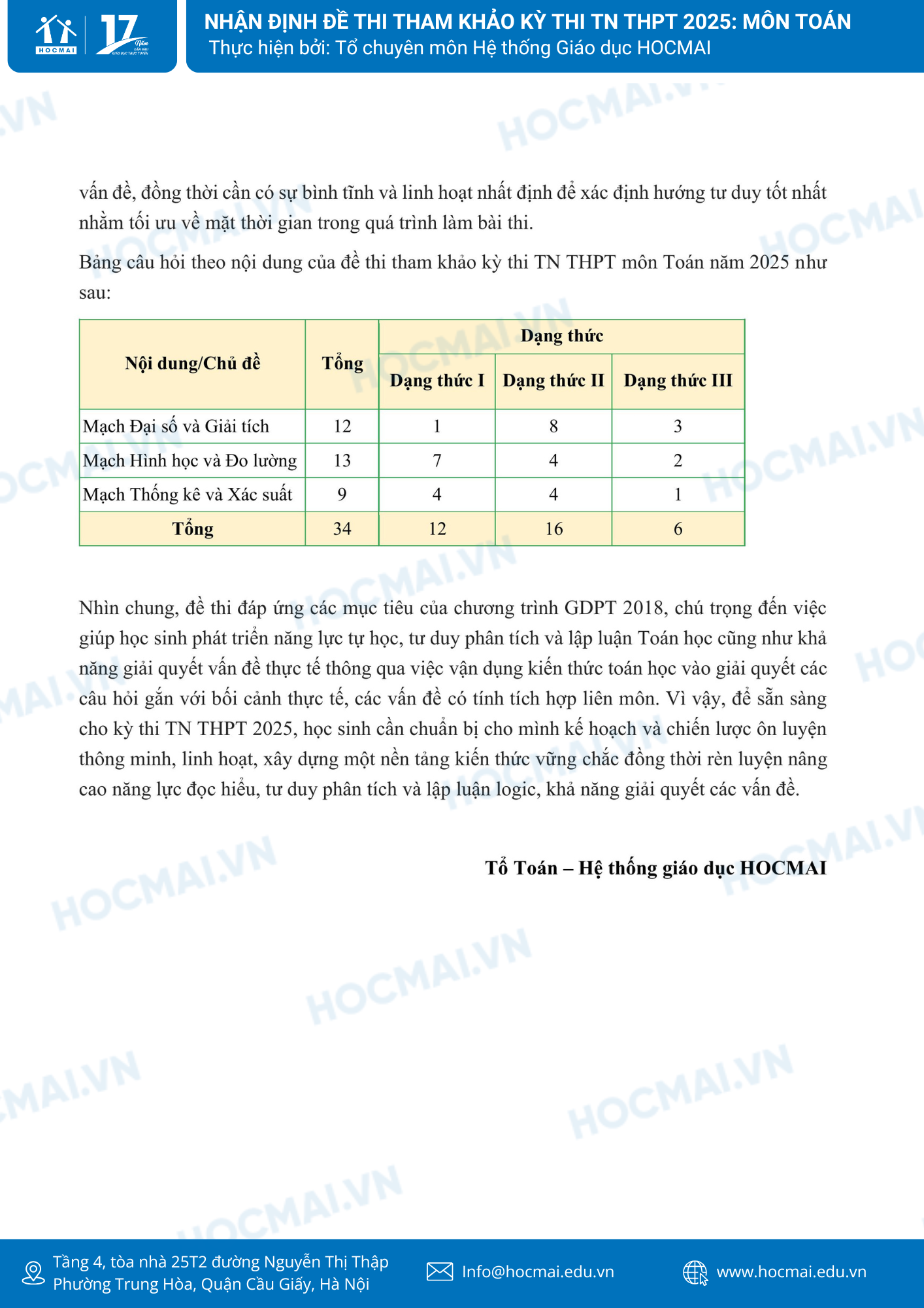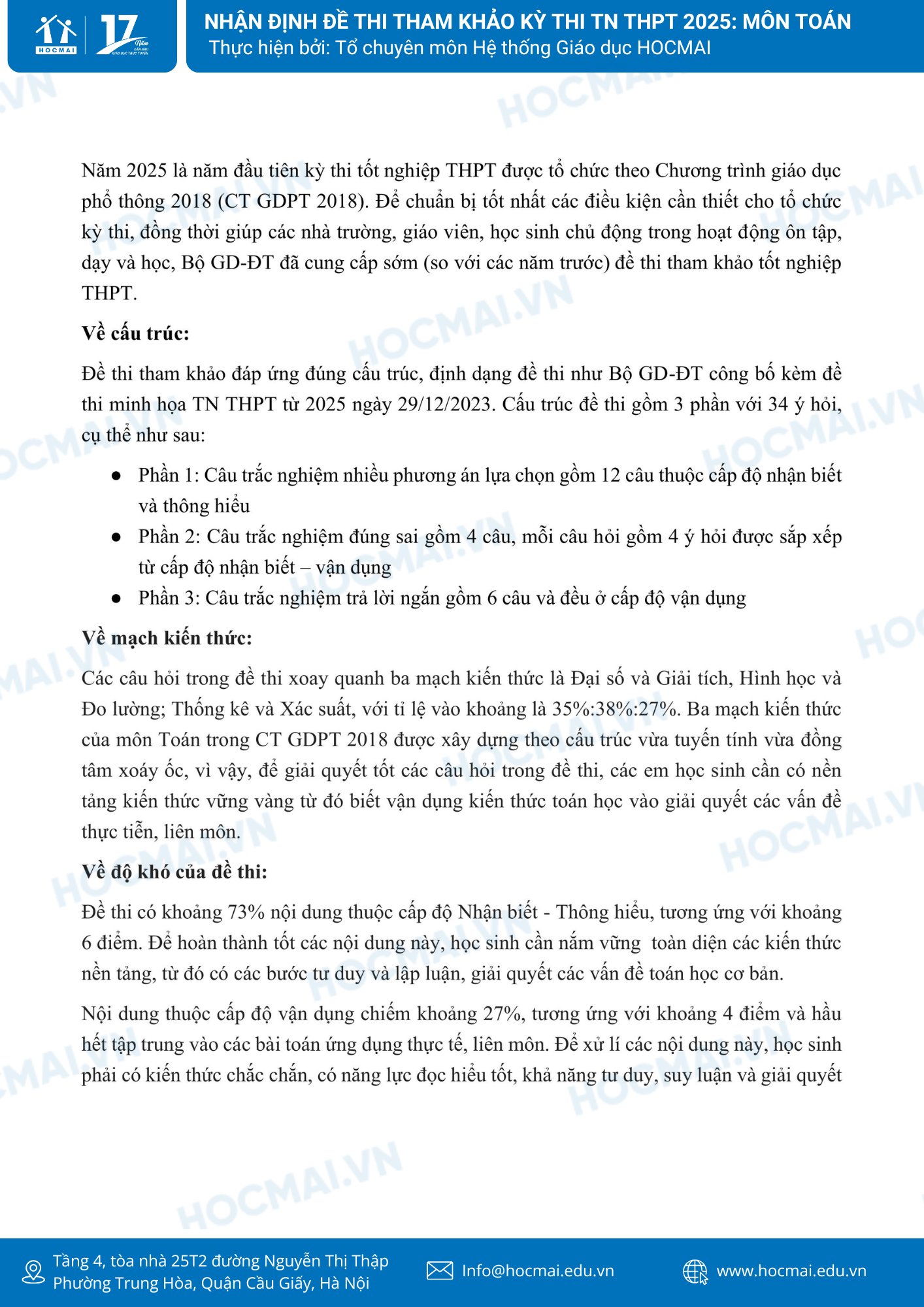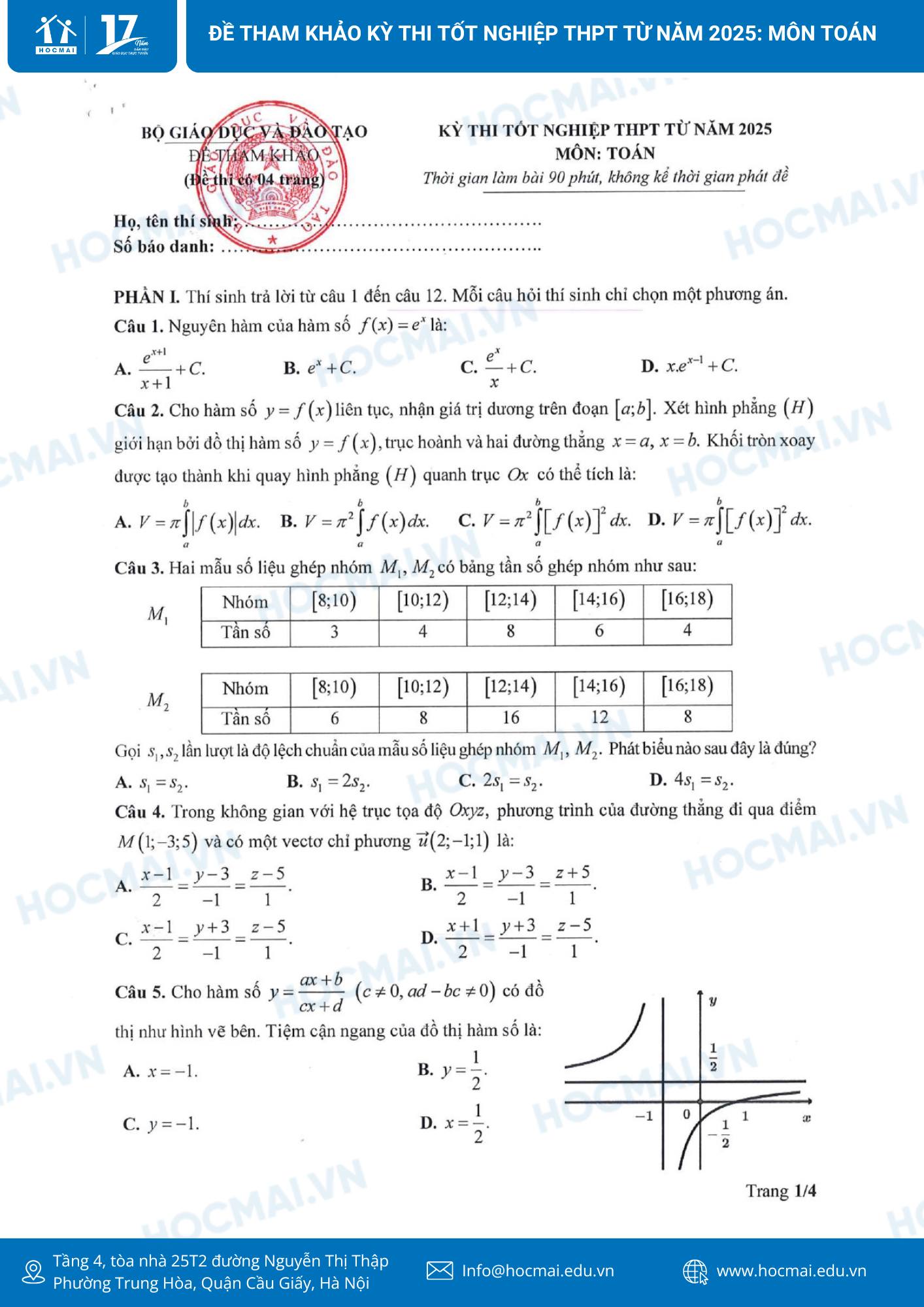 Để chuẩn bị tốt nhất các điều kiện cần thiết cho tổ chức Kỳ thi, đồng thời giúp các nhà trường, giáo viên, học sinh chủ động trong hoạt động ôn tập, dạy và học, ngay từ đầu năm học Bộ GDĐT đã chỉ đạo các đơn vị xây dựng kế hoạch, chuẩn bị từ sớm, từ xa các công việc, nhiệm vụ về công tác chuẩn bị và tổ chức Kỳ thi, trong đó có việc xây dựng đề thi tham khảo cho Kỳ thi tốt nghiệp THPT từ năm 2025. Dưới đây là nhận định đề thi tham khảo môn toán do đội ngũ giáo viên môn Toán thuộc Hệ thống giáo dục HOCMAI thực hiện ngay sau khi Bộ GD&ĐT công bố đề thi tham khảo, phụ huynh và học sinh cùng theo dõi!
