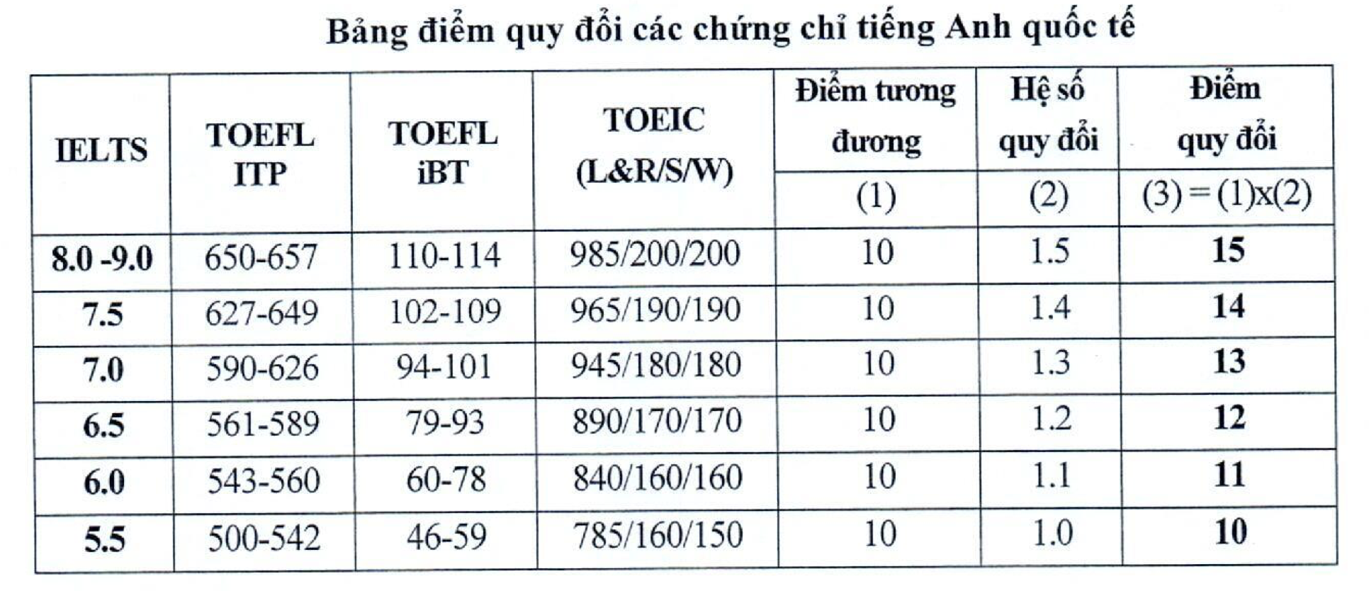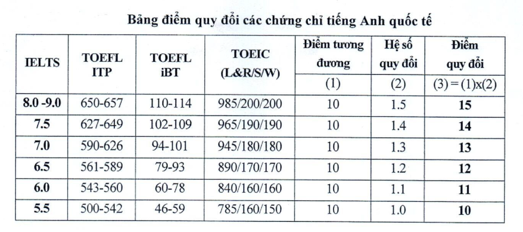 (1) Có chứng chỉ tiếng Anh quốc tế trong thời hạn 2 năm tính đến 1/6/2022 đạt IELTS 5.5 hoặc TOEFL ITP 500 hoặc TOEFL iBT 46 hoặc TOEIC (4 kỹ năng: L&R 785, S 160 & W 150) trở lên;