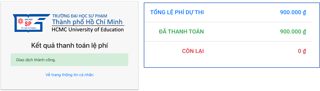 Sau khi quá trình thanh toán hoàn tất, hệ thống sẽ tự động quay lại trang đăng ký và hiển thị kết quả giao dịch. Số tiền thanh toán sẽ được cập nhật tự động trên Trang đăng ký (nếu giao dịch thành công).