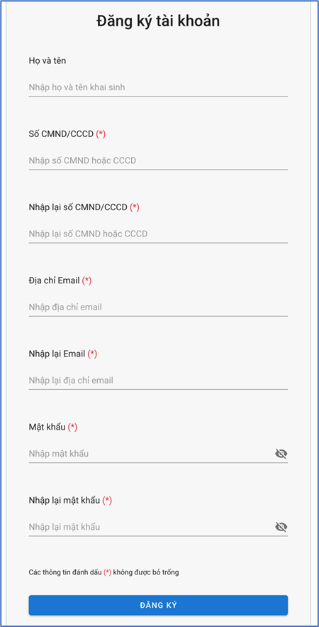 Thí sinh chọn “Đăng ký tài khoản mới” và nhập đầy đủ và chính xác các thông tin, bao gồm: Họ và tên khai sinh, Số CMND/CCCD, Email, Mật khẩu (lưu ý: các thông tin này không thể chỉnh sửa sau khi hoàn thành thao tác đăng ký)