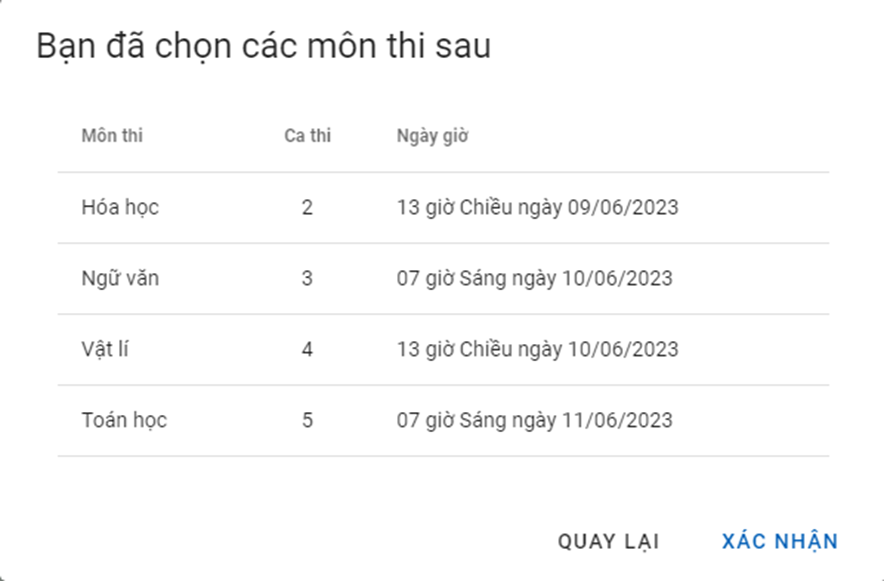 Sau khi lựa chọn ca thi thành công, hệ thống sẽ hiển thị lần lượt thông tin các ca thi với ngày giờ cụ thể, cùng với các môn thi được tổ chức trong các ca thi tương ứng.