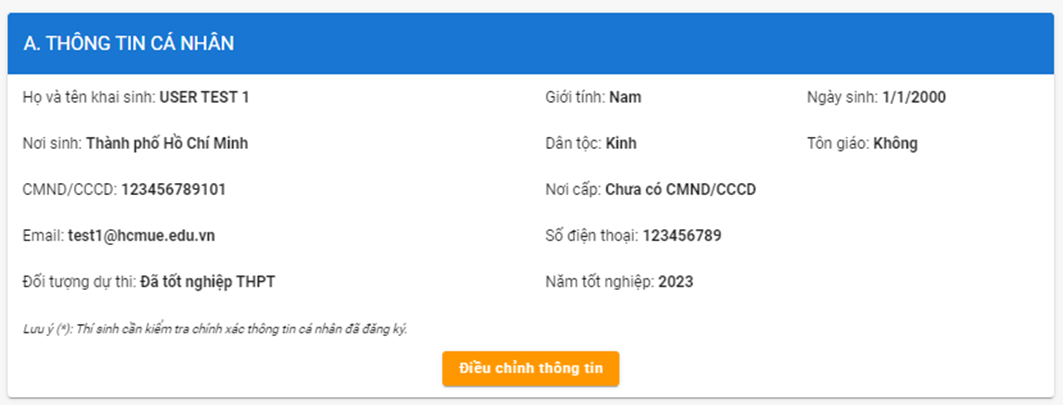 Thí sinh nhấn vào mục Họ tên thí sinh để chuyển qua giao diện Trang cá nhân để quản lý các thông tin đã đăng ký. Các thông tin bao gồm: