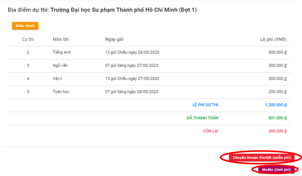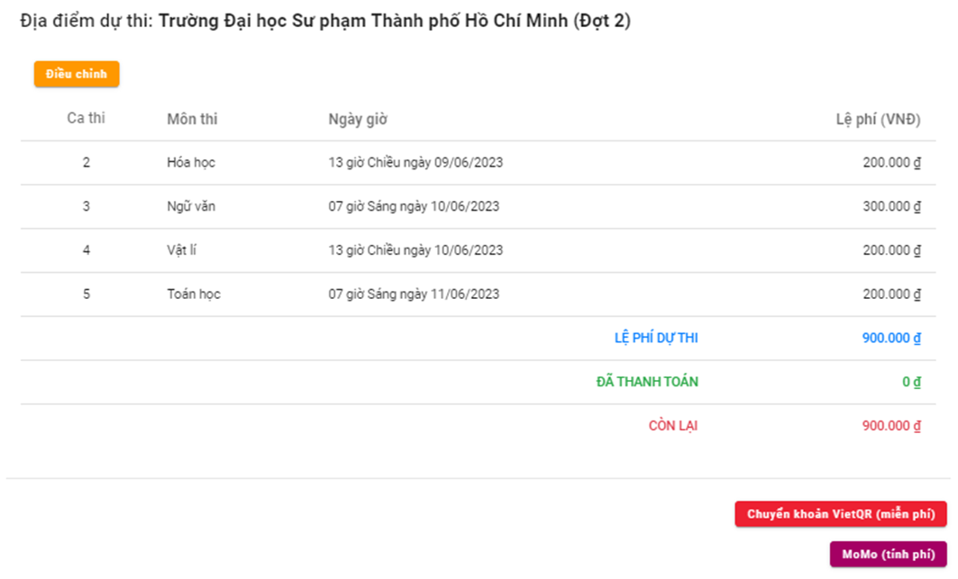 – Thí sinh không được tắt ứng dụng MoMo và trình duyệt web khi quá trình thanh toán đang diễn ra để tránh xảy ra những sự cố không cần thiết. Thanh toán bằng Ví điện tử Momo, thí sinh sẽ phải thanh toán thêm phí dịch vụ do Momo quy định.