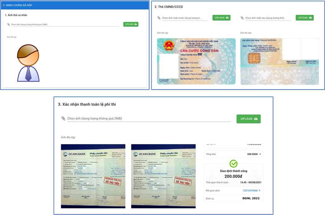 – Các hình ảnh minh chứng thanh toán lệ phí sẽ được sử dụng cho việc đối sánh với dữ liệu chuyển khoản để xác minh thí sinh đã thanh toán lệ phí dự thi và là căn cứ để giải quyết cho các sự cố liên quan đến lệ phí sau này.