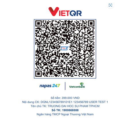 Lưu ý: Thí sinh phải ghi CHÍNH XÁC nội dung chuyển khoản theo mẫu ghi sẵn theo thông tin dưới mã QR. Số tiền cần chuyển khoản là lệ phí dự thi chưa bao gồm phí chuyển khoản (nếu có). Sau khi thí sinh chuyển khoản thành công, hệ thống sẽ cập nhật số tiền đã thanh toán trong vòng 7 ngày làm việc (không tính Thứ bảy, Chủ nhật và ngày Lễ).