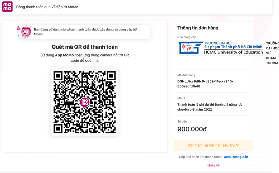 – Thí sinh nhấn nút Thanh toán MoMo để chuyển sang giao diện thanh toán của trang MoMo.