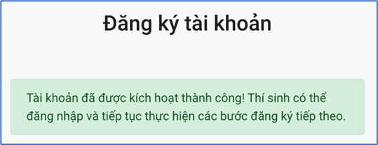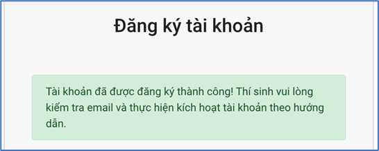 Thí sinh nhấn nút đăng ký để hoàn thành thao tác. Nếu tài khoản hợp lệ, thí sinh sẽ nhận được email hướng dẫn kích hoạt tài khoản.