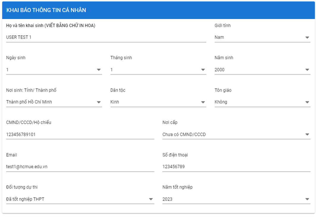 Thí sinh đăng nhập tài khoản theo bước 3 và nhập các thông tin cá nhân dưới đây: