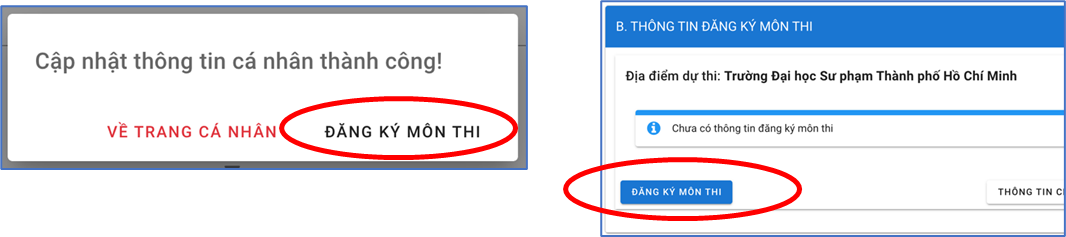 Sau khi đăng ký thông tin thành công, thí sinh có thể tiếp tục đăng ký môn thi bằng cách nhấn nút Đăng ký môn thi; hoặc nhấn nút Đăng ký môn thi tại mục B của Trang cá nhân.