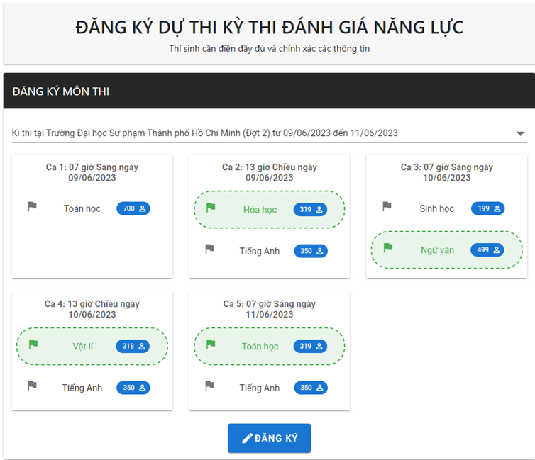 Lưu ý: KHÔNG THỂ đăng ký nhiều hơn 1 môn thi trong cùng ca thi, và KHÔNG THỂ đăng ký trùng môn thi trong các ca thi khác nhau.
