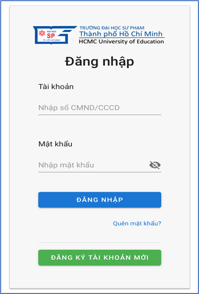 Thí sinh nhập tài khoản và mật khẩu để đăng nhập. Trong trường hợp thí sinh chưa có tài khoản cần đăng ký tài khoản mới.