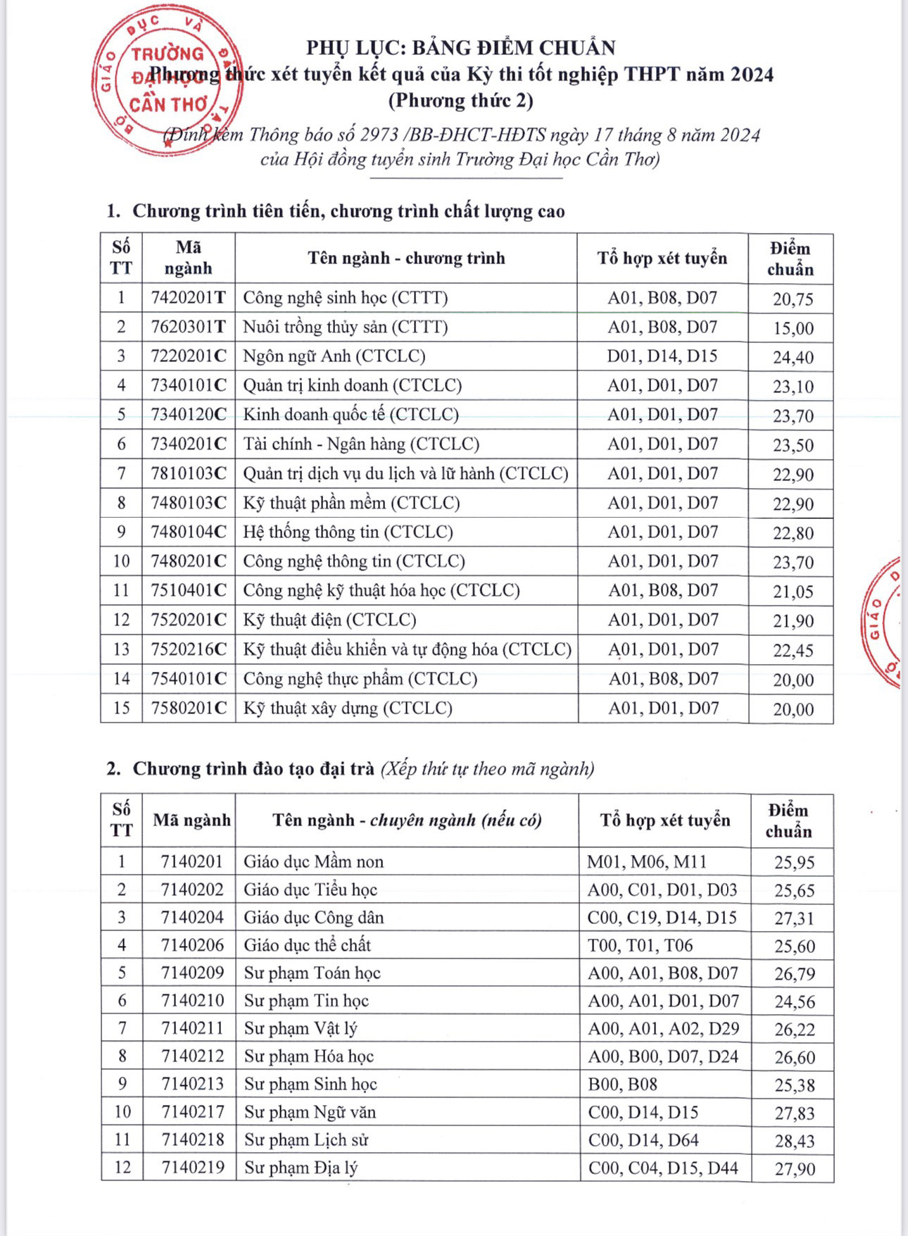 Tuyển sinh 2024: Đại học Cần Thơ công bố điểm chuẩn 2024