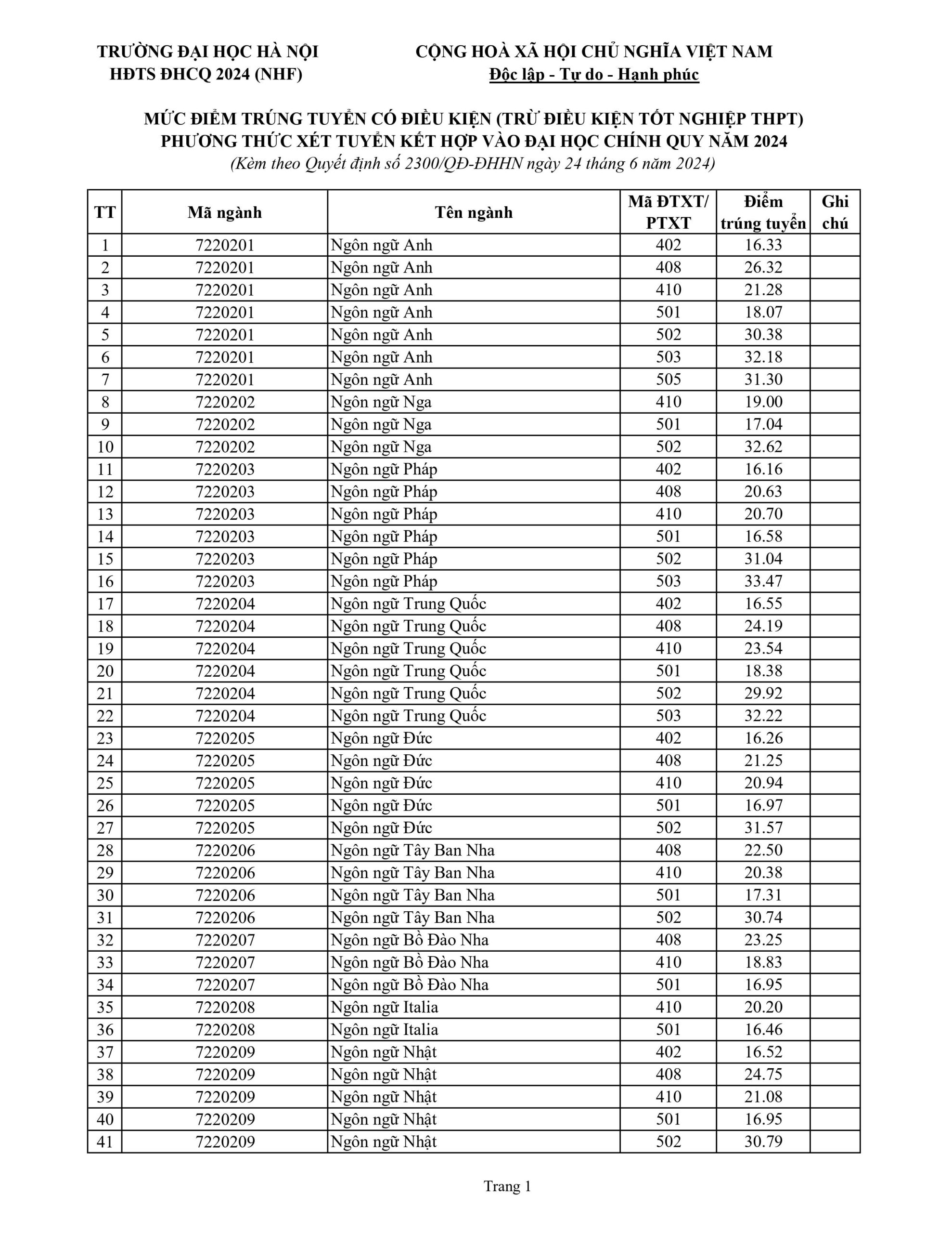 Theo đó, mức điểm trúng tuyển có điều kiện (trừ điều kiện tốt nghiệp THPT) phương thức xét tuyển kết hợp vào đại học chính quy năm 2024 ban hành kèm theo Quyết định 2300/QĐ-ĐHHN năm 2024 cụ thể như sau: