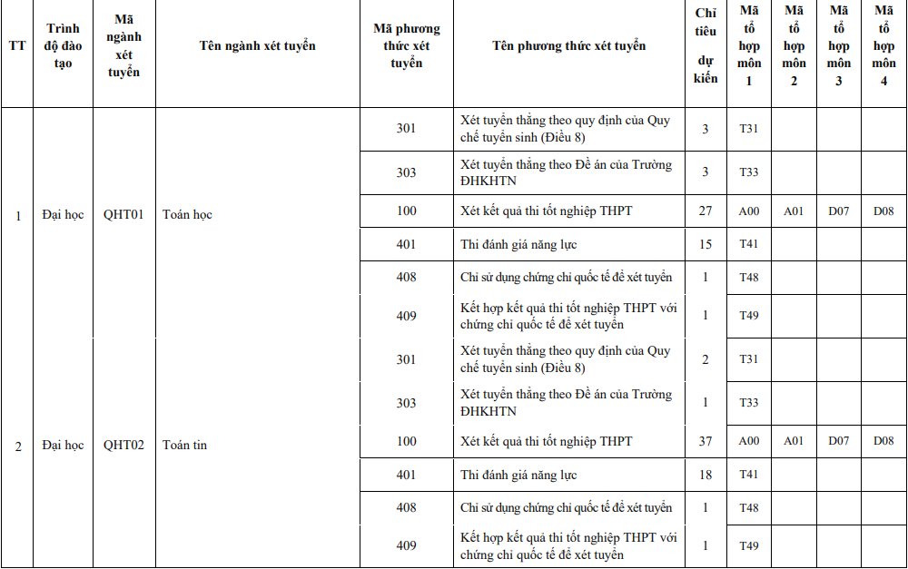 Riêng với 4 ngành Toán học, Toán tin, Khoa học máy tính và thông tin, Khoa học dữ liệu, điểm xét tuyển là tổng điểm môn Toán (nhân hệ số 2) cộng với điểm Tiếng Anh đã quy đổi và cộng với điểm cao nhất của một môn còn lại trong các tổ hợp xét tuyển.