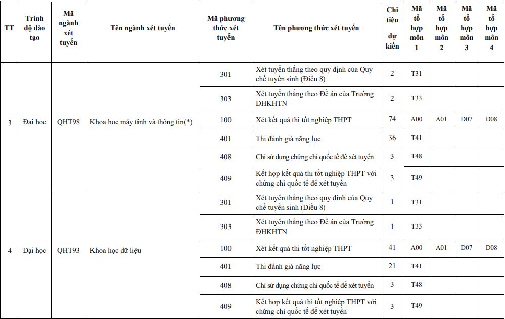Riêng với 4 ngành Toán học, Toán tin, Khoa học máy tính và thông tin, Khoa học dữ liệu điểm xét tuyển được quy định như sau: Điểm xét tuyển là tổng điểm Tư duy định lượng (nhân hệ số 2) cộng với điểm Tư duy định tính và cộng với điểm Khoa học.