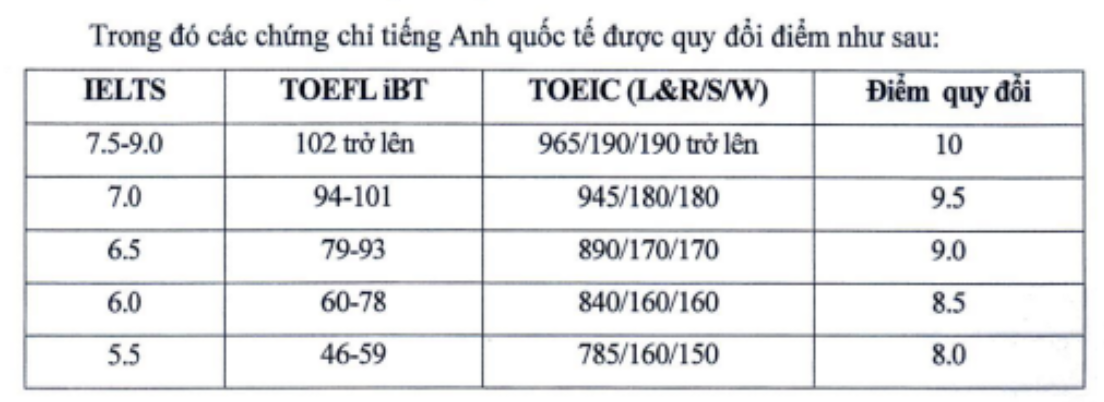– Điều kiện nhận hồ sơ: Thí sinh có chứng chỉ tiếng Anh quốc tế trong thời hạn 2 năm tính đến 1/6/2024 đạt IELTS 5.5 hoặc TOEFL iBT 46 hoặc TOEIC (4 kỹ năng: L&R 785, S 160 & W 150) trở lên và có kết quả tốt nghiệp THPT 2024 của môn Toán và 1 môn khác môn tiếng Anh thuộc tổ hợp xét tuyển của trường.