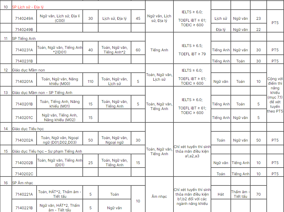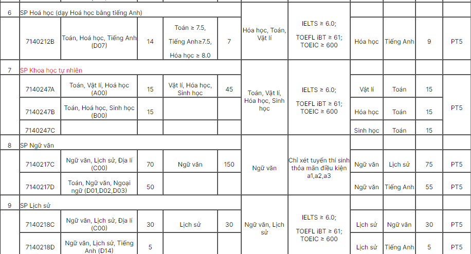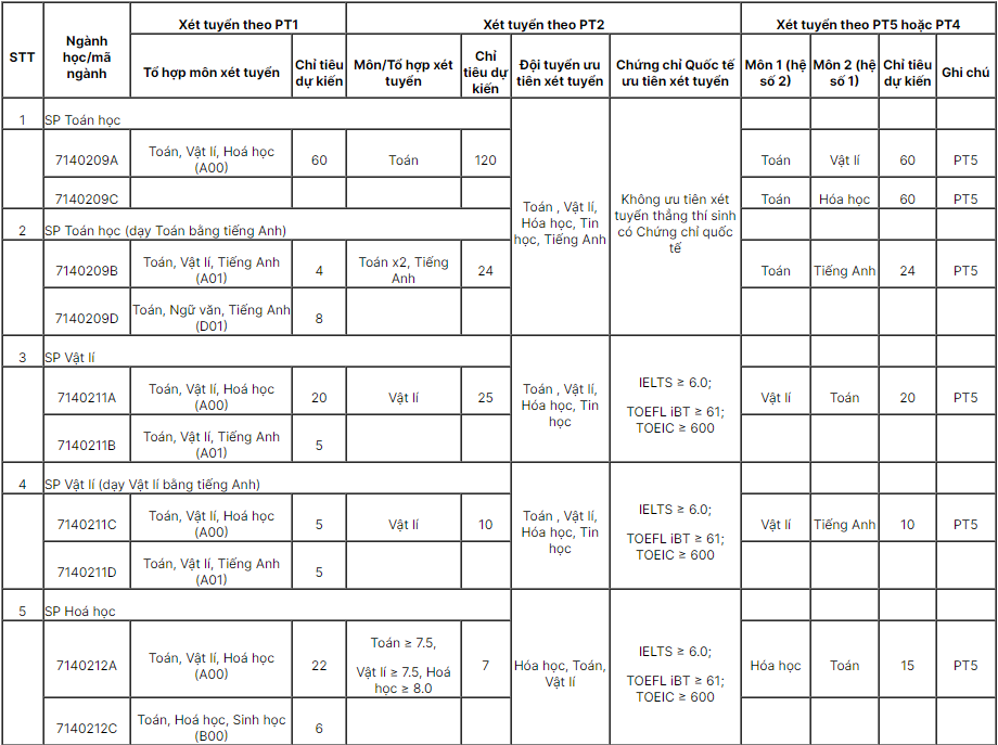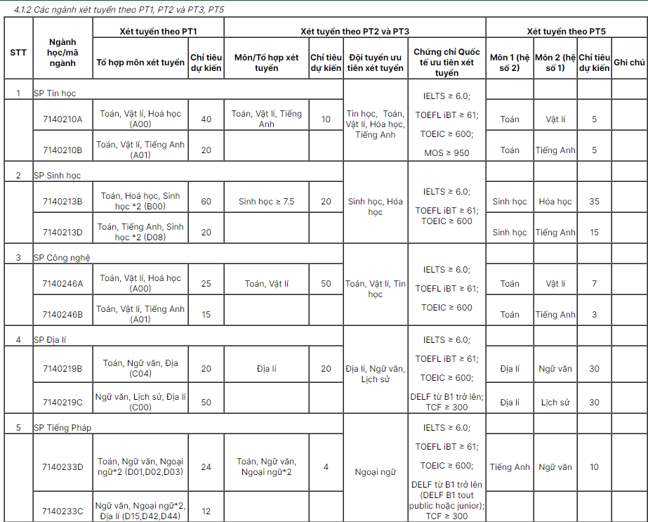 3.5. Phương thức tuyển sinh 5 (PT5): Xét tuyển dựa trên kết quả thi đánh giá năng lực do Trường ĐHSP Hà Nội hoặc Trường ĐHSP thành phố Hồ Chí Minh tổ chức thi trước ngày 25/5/2024 kết hợp với điều kiện về kết quả học cấp THPT (Tên ngành học, mã ngành, chỉ tiêu và tổ hợp xét tuyển, xem cụ thể tại mục 4). Thí sinh được đăng kí tối đa 02 nguyện vọng xét tuyển theo PT5; có thể đăng kí 02 tổ hợp khác nhau để xét tuyển vào cùng một ngành đào tạo, nếu có.