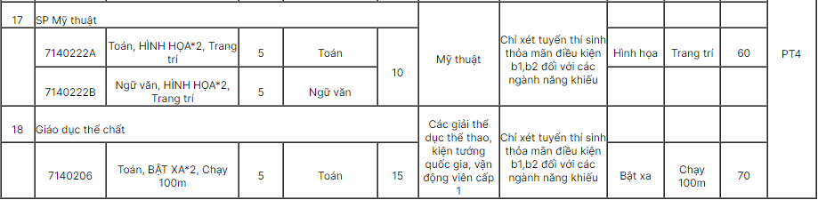 3.4. Phương thức tuyển sinh 4 (PT4): Áp dụng đối với thí sinh đăng kí xét tuyển vào các ngành Sư phạm Âm nhạc, Sư phạm Mỹ thuật, Giáo dục thể chất; xét tuyển dựa trên kết quả thi năng khiếu năm 2024 do Trường ĐHSP Hà Nội tổ chức, kết hợp với điều kiện về kết quả học tập cấp THPT. Thí sinh chỉ được đăng kí xét tuyển dựa trên kết quả thi năng khiếu vào duy nhất một ngành đào tạo.