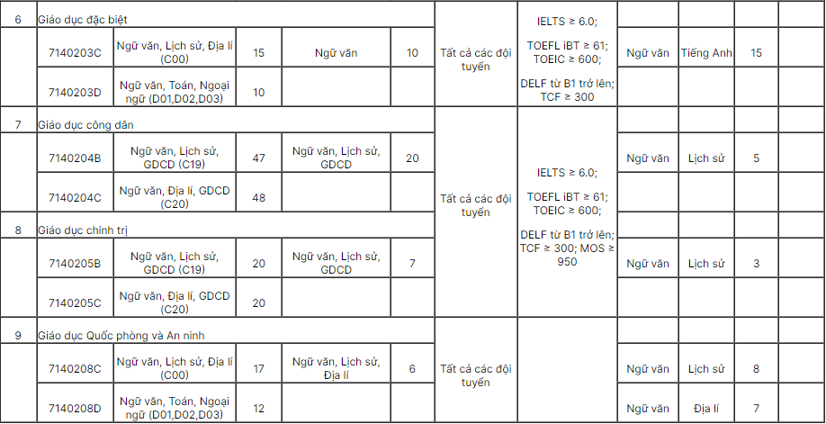 – Thí sinh dự thi vào ngành Giáo dục Quốc phòng và An ninh phải có sức khỏe tốt, thí sinh mắc tật khúc xạ cận hoặc viễn thị không quá 3dp; không có dị tật bẩm sinh, hình xăm phản cảm. Nam cao từ 1,60m trở lên; nữ cao từ 1,55m trở lên.