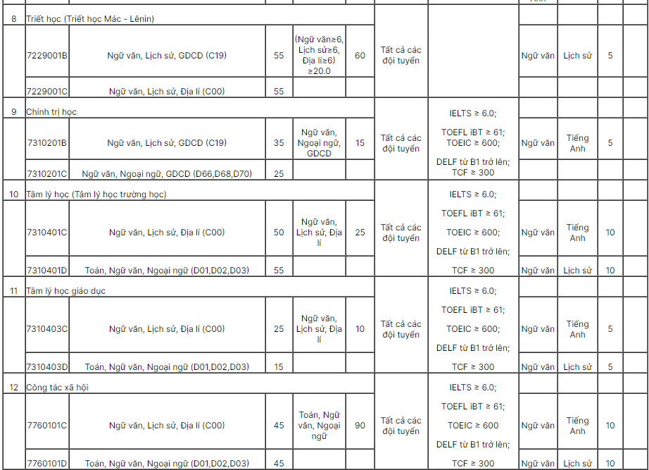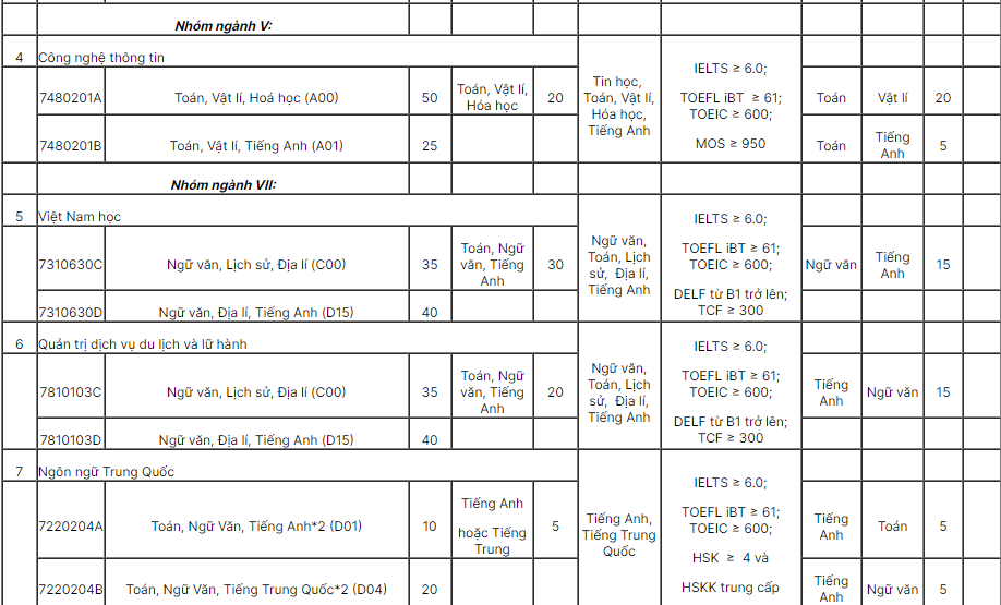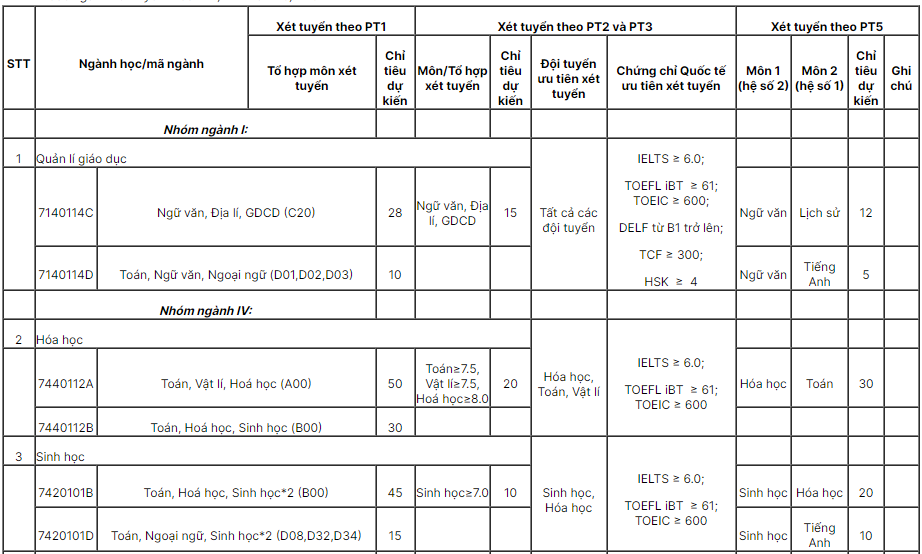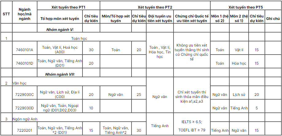 – Các thí sinh trúng tuyển các ngành Sư phạm Tin học, Sư phạm Sinh học sau khi nhập học có thể đăng kí để nhà trường xét tuyển tương ứng vào học các ngành Sư phạm Tin học (dạy Tin học bằng tiếng Anh), Sư phạm Sinh học (dạy Sinh học bằng tiếng Anh), nếu có nguyện vọng.