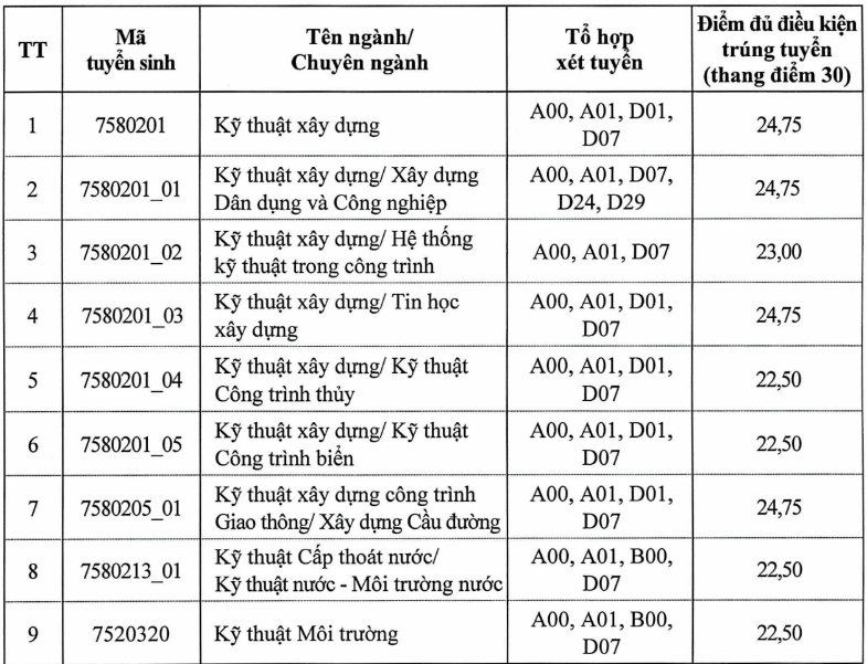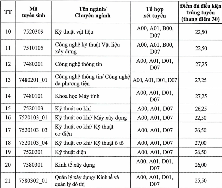 Điểm chuẩn xét tuyển sớm theo phương thức xét tuyển học bạ của của trường Đại học xây dựng Hà Nội như sau: