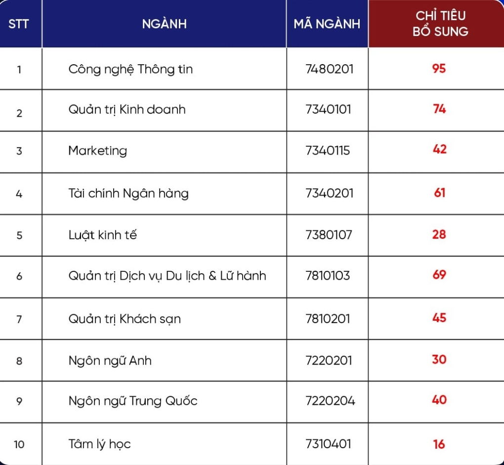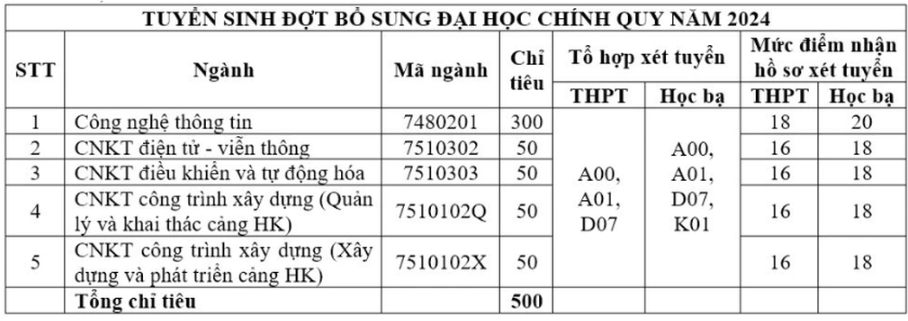 Nhà trường cho biết, từ nay đến ngày 31/8, trường tiếp tục xét tuyển bổ sung bằng phương thức xét học bạ cho 20 ngành đào tạo, với mức điểm tối thiểu là điểm trung bình tổ hợp 3 môn trên 18 điểm.