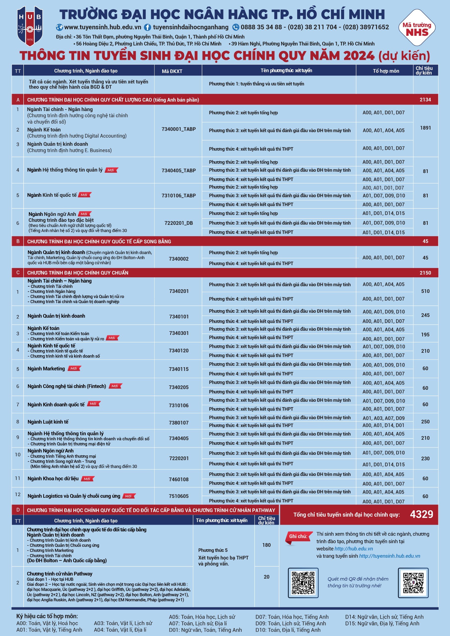 Theo thông tin tuyển sinh mới nhất cho ĐH Ngân hàng TPHCM công bố, năm 2024, trường dự kiến tuyển sinh nhiều ngành học mới, tăng chi tiêu xét tuyển lên 4329.