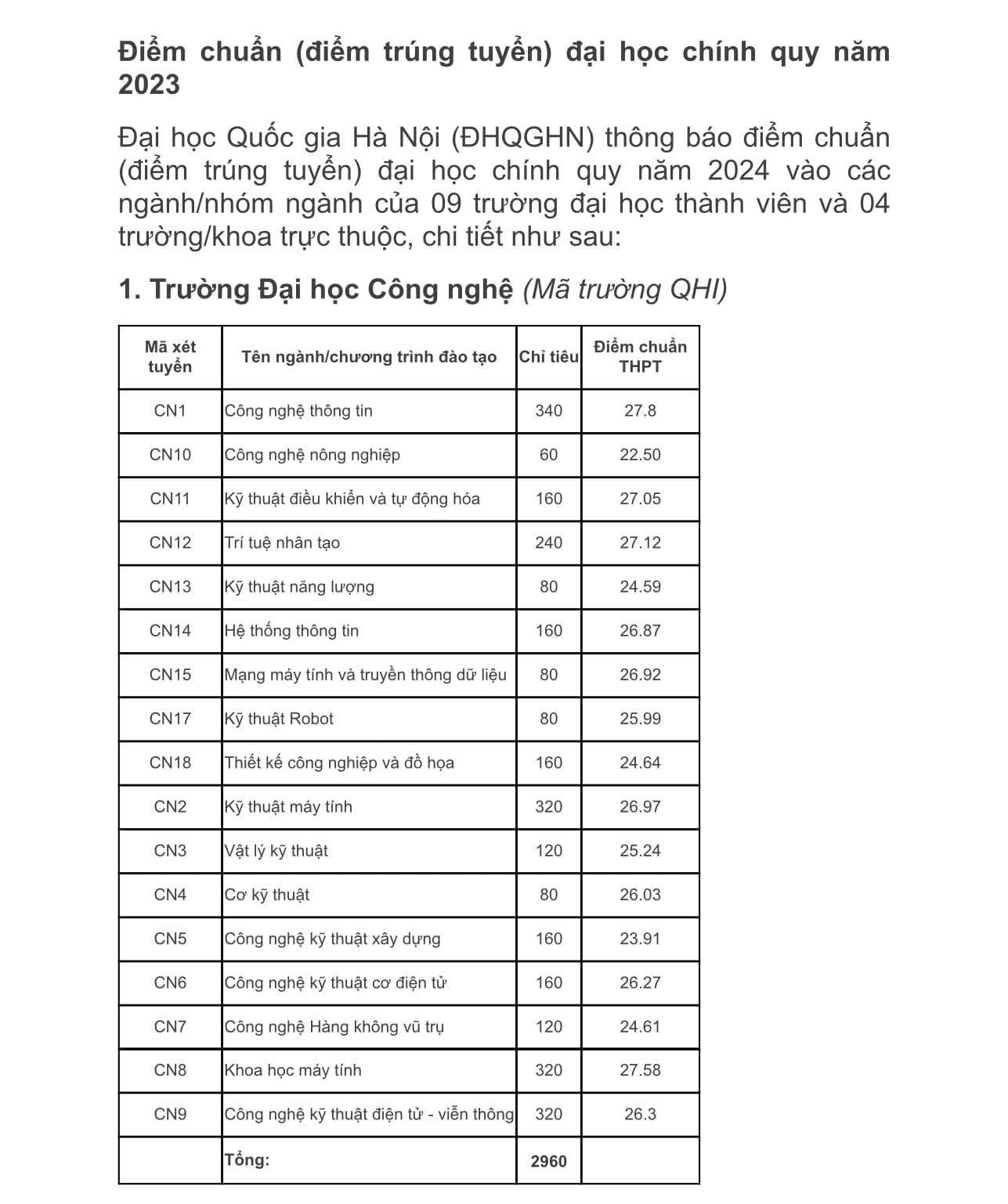 Năm 2024, Trường Đại học Công nghệ dự kiến tuyển sinh 2.960 chỉ tiêu (tăng hơn 1.000 chỉ tiêu so với 2023) cho 17 ngành đào tạo đại học chính quy thuộc 3 lĩnh vực: Máy tính và Công nghệ thông tin; Công nghệ kỹ thuật; Kỹ thuật.