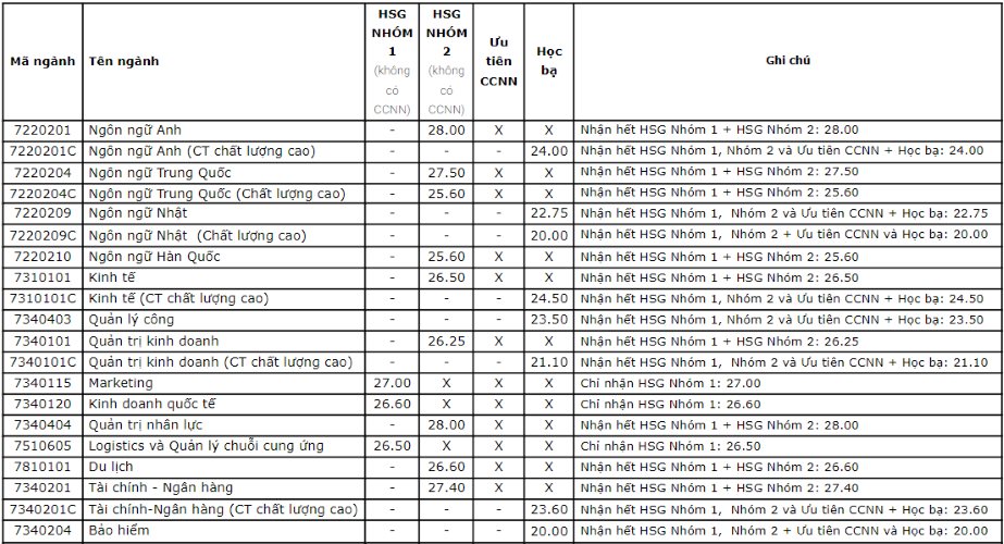 Thí sinh đủ điều kiện là học sinh Giỏi (thuộc nhóm 1 hoặc nhóm 2) và có Chứng chỉ Ngoại ngữ theo quy định đủ điều kiện trúng tuyển vào tất cả các ngành.