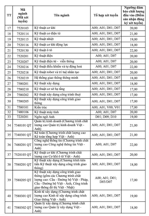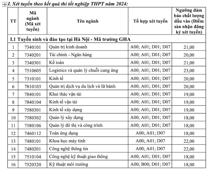 Chiều 18.7, Trường Đại học Giao thông vận tải công bố ngưỡng đảm bảo chất lượng đầu vào (điểm sàn nhận đăng ký xét tuyển) đại học hệ chính quy năm 2024.
