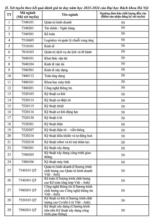 Theo phương thức xét theo kết quả đánh giá tư duy năm 2023-2024 của Đại học Bách khoa Hà Nội như sau: