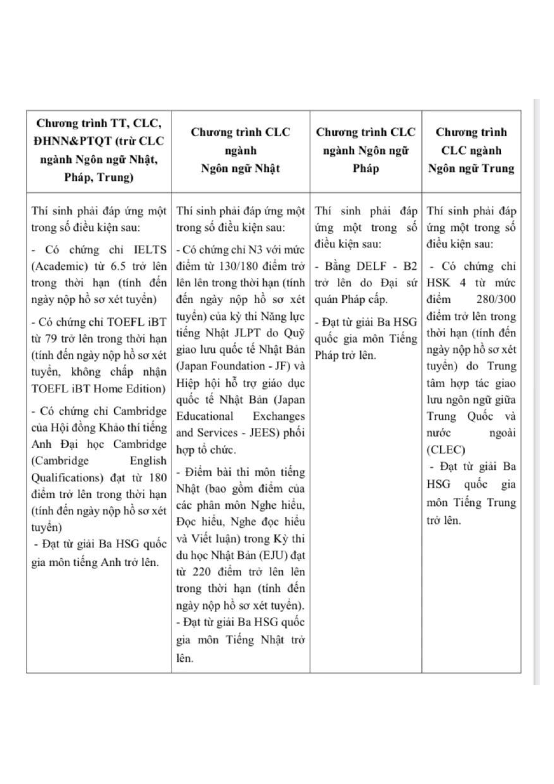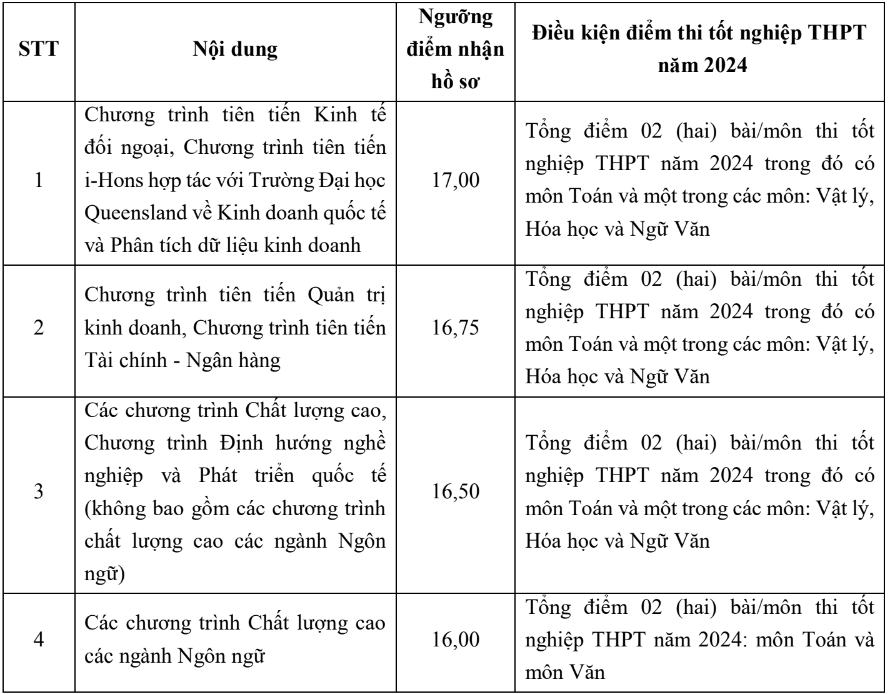 Nhà trường lưu ý, đối với ngành ngôn ngữ (các chương trình tiếng Anh thương mại, tiếng Pháp thương mại, tiếng Nhật thương mại, tiếng Trung thương mại), mức điểm nhận hồ sơ xét tuyển là tổng điểm của tổ hợp ba môn toán, văn, ngoại ngữ và điểm ưu tiên khu vực và đối tượng nếu có (trong đó điểm môn ngoại ngữ nhân hệ số 1).