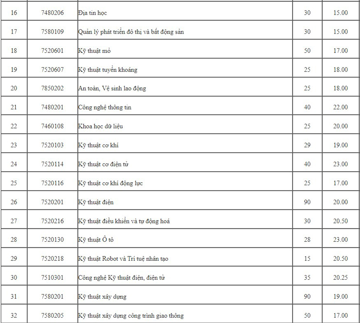 Hai ngành lấy cao nhất là Kỹ thuật cơ điện tử và Kỹ thuật ôtô, theo sau là Công nghệ thông tin – 22 điểm. Các ngành còn lại lấy điểm sàn phổ biến 15, 16, 17, 18. Đây là tổng điểm ba môn đã bao gồm điểm ưu tiên.