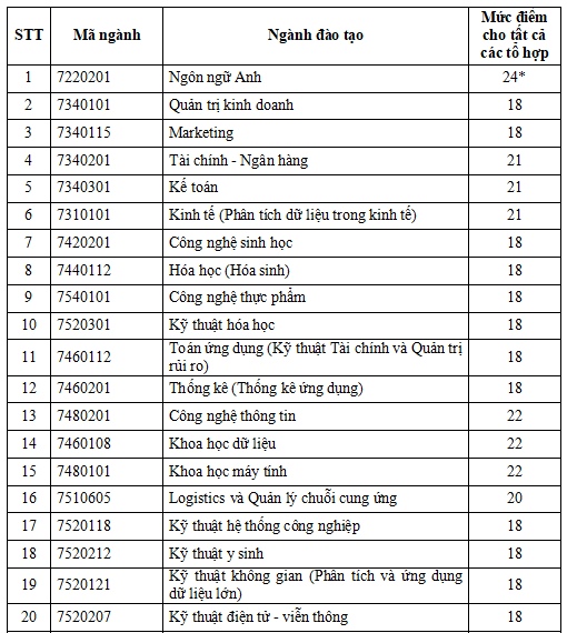 Mức điểm sàn cao nhất thuộc về các ngành Công nghệ thông tin, Khoa học dữ liệu, Khoa học máy tính với 22 điểm.