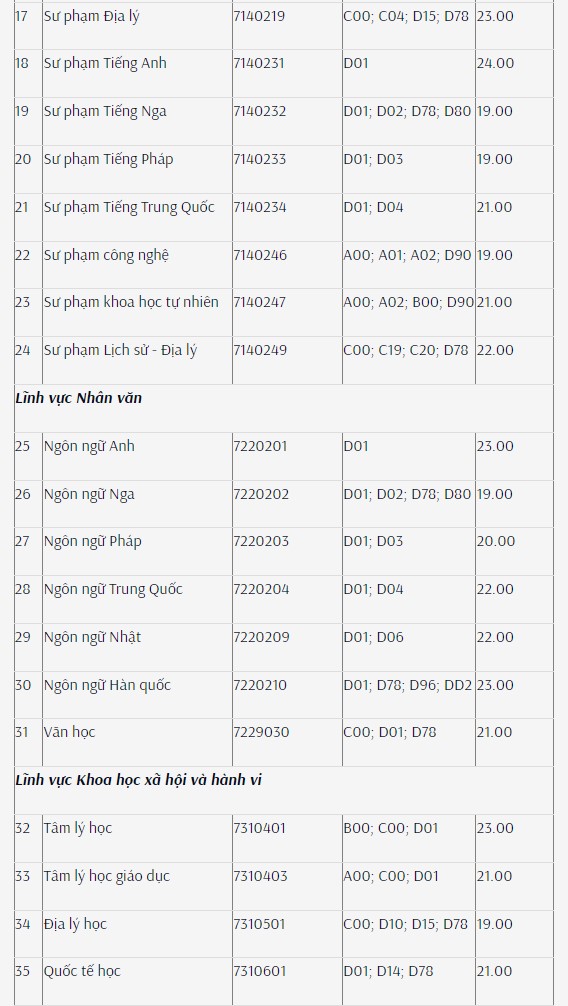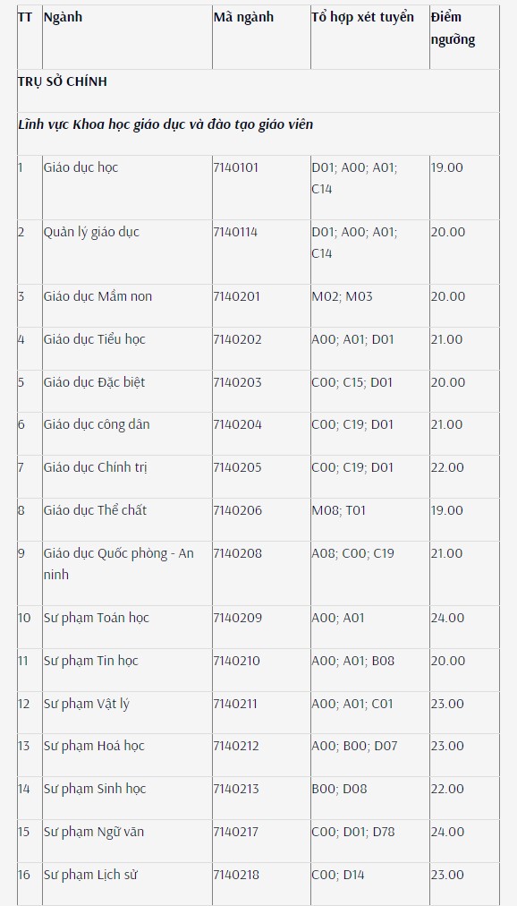 Lưu ý, đối với ngành Giáo dục Mầm non (trình độ đại học, đào tạo tại trụ sở chính), ngưỡng đảm bảo chất lượng đầu vào được quy định như sau: điểm môn Toán hoặc điểm môn Ngữ văn (theo tổ hợp xét tuyển) + (điểm ưu tiên khu vực, đối tượng theo quy định)*1/3 (làm tròn đến 2 chữ số thập phân), tối thiểu bằng 6.67 điểm.