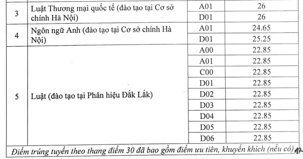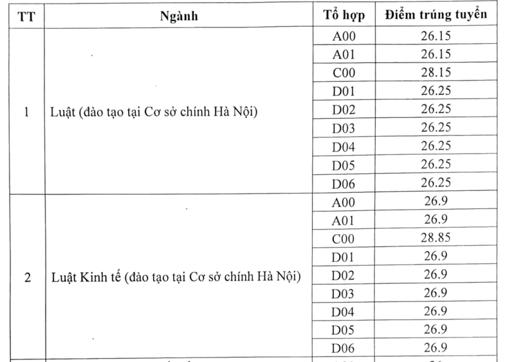 Tối 17/8, Đại học Luật Hà Nội công bố điểm chuẩn theo phương thức xét điểm thi tốt nghiệp. Đây là tổng điểm ba môn trong tổ hợp, đã cộng điểm ưu tiên (nếu có).