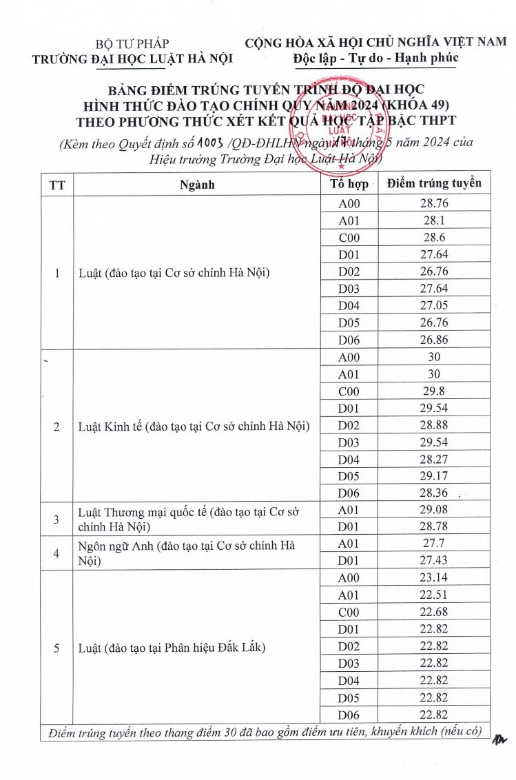 Theo Trường đại học Luật Hà Nội, mức điểm trúng tuyển đã tính điểm ưu tiên và điểm khuyến khích (nếu có).