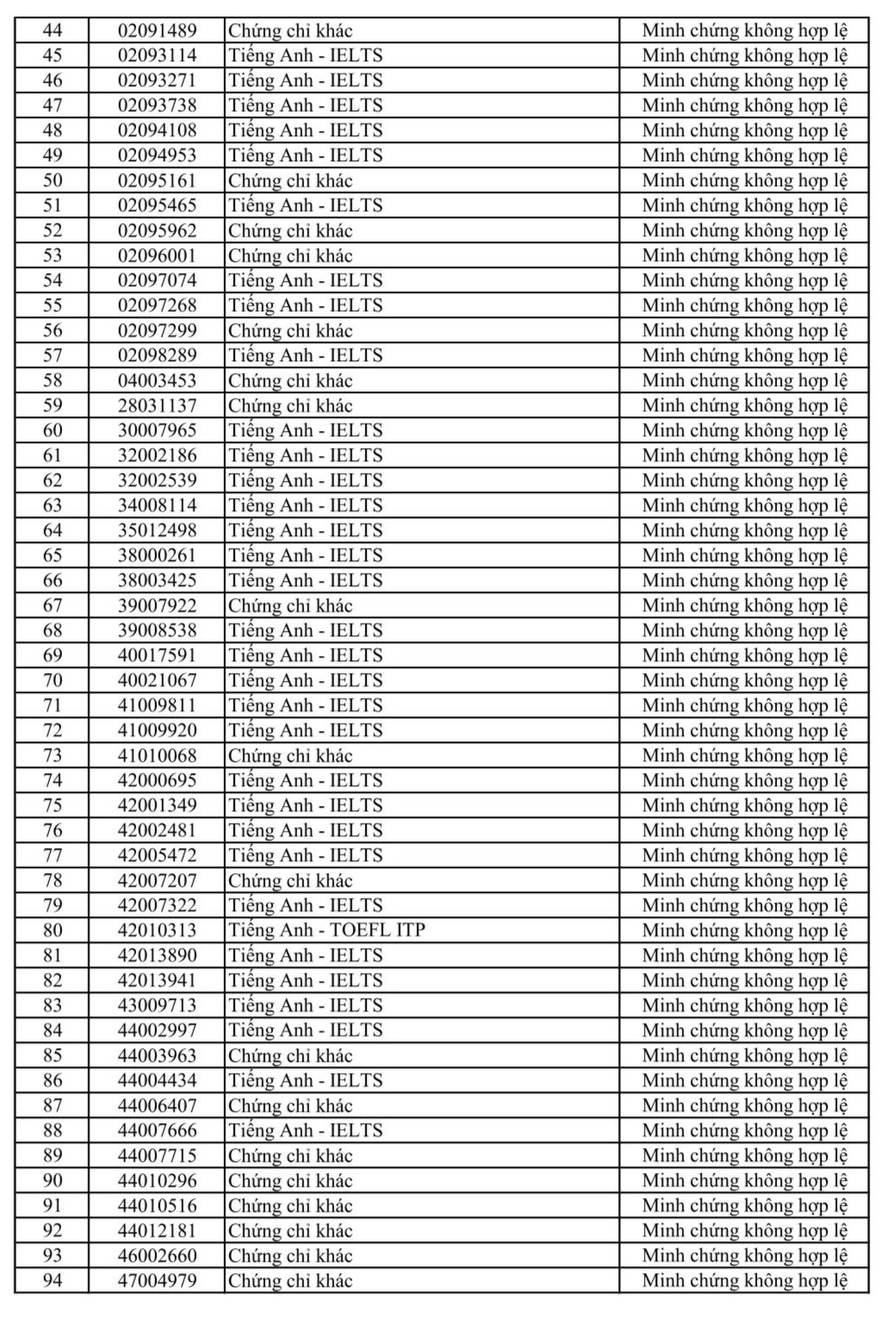 Số thí sinh không được quy đổi 130 thí sinh trình minh chứng IELTS, TOEFL, VSTEP… nhưng không hợp lệ