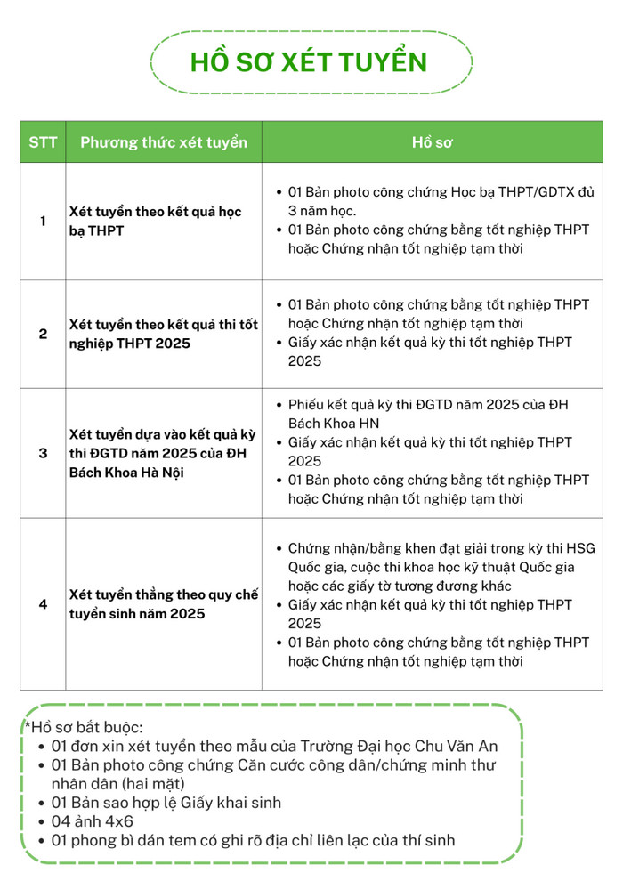 Năm 2025, trường Đại học Chu Văn An tuyển sinh 650 chỉ tiêu cho 6 ngành đào tạo dựa trên 4 phương thức xét tuyển như sau: