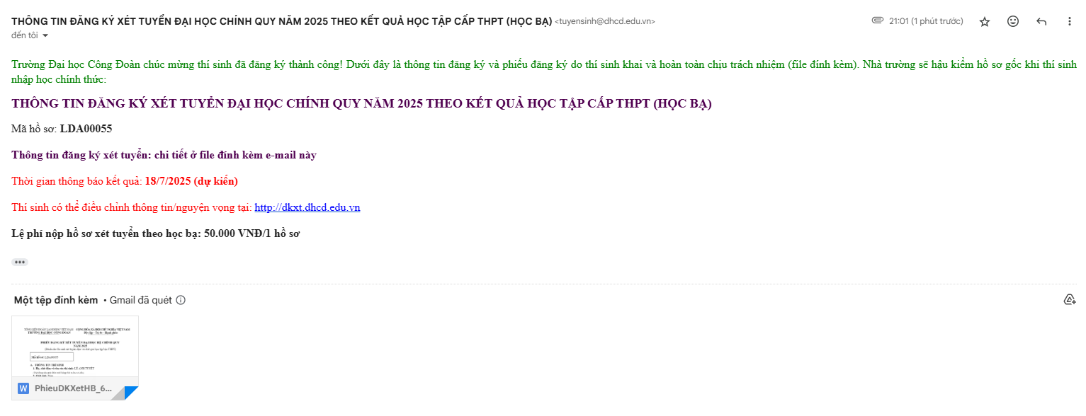 Xét tuyển dựa vào kết quả kỳ thi tốt nghiệp THPT năm 2025 (mã phương thức xét tuyển 100): thí sinh đăng ký xét tuyển theo hướng dẫn của Bộ GD&ĐT.